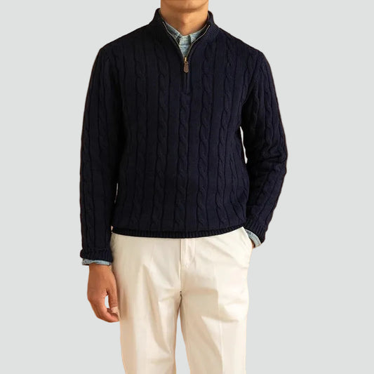 Stijlvolle Heren Kabelgebreide Half-Zip Trui met Hoge Kraag
