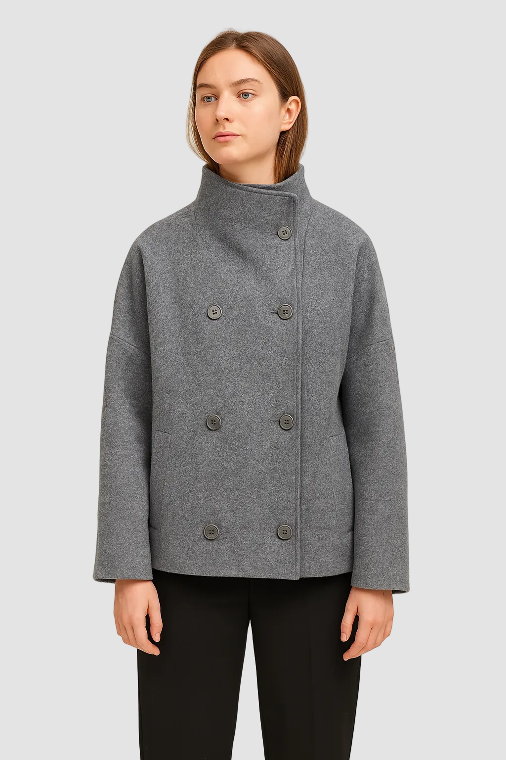 Deze stijlvolle dames jas van wolblend biedt een luxe uitstraling en uitzonderlijk draagcomfort. De hoge kraag geeft niet alleen een moderne, sculpturale look, maar biedt ook extra warmte tijdens koudere dagen. Dankzij de dubbele knopen creëert de jas een elegante en verfijnde afwerking die perfect past bij zowel casual outfits als meer geklede looks. De rechte pasvorm maakt het ontwerp tijdloos en makkelijk te combineren met verschillende stijlen en silhouetten. Dit is een veelzijdig kledingstuk dat moeiteloos warmte, comfort en verfijning samenbrengt voor elke gelegenheid.
