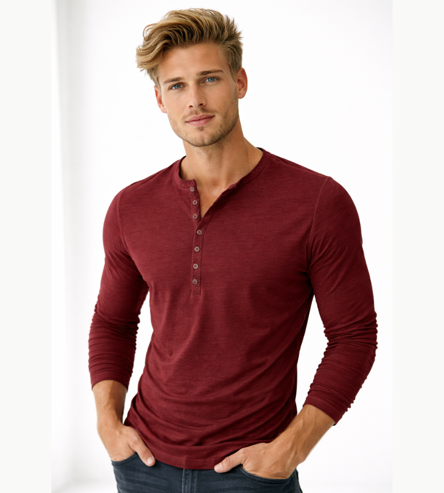 Dit heren casual henleyshirt met lange mouwen is een veelzijdige basic voor een stoere, relaxte look en ideaal voor dagelijks gebruik in het najaar en de winter. De knoopsluiting aan de hals geeft het shirt een subtiel accent, terwijl de lange mouwen zorgen voor extra comfort en een nette uitstraling zonder moeite. Toon het shirt in een licht driekwart-vooraanzicht op model met de bovenste knoop open, zodat de halslijn, knopen en pasvorm direct opvallen. Perfect te combineren met jeans, chino’s of een overshirt voor weekend, reizen en casual dagen.