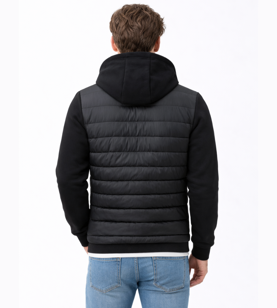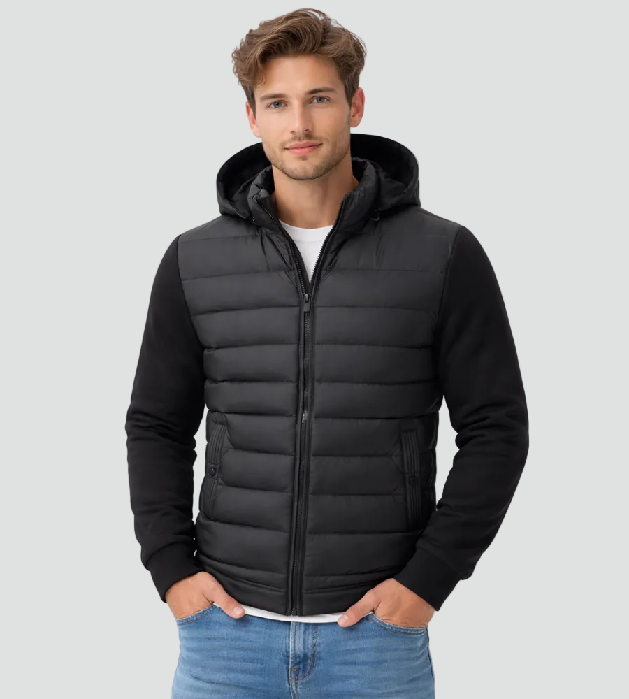 Deze heren hybride gewatteerde winterjas met capuchon is gemaakt voor koud, winderig weer en is ideaal voor dagelijks gebruik in de herfst en winter. Het gewatteerde voorpand geeft extra warmte, terwijl de sportieve mouwen zorgen voor een comfortabele bewegingsvrijheid, perfect voor woon-werkverkeer en buitenmomenten. Toon de jas in een recht vooraanzicht met gesloten rits zodat de capuchon, panelen en zakdetails direct opvallen en de pasvorm duidelijk zichtbaar is. Een veelzijdige winterjas die moeiteloos past bij zowel casual outfits als een nette citylook.