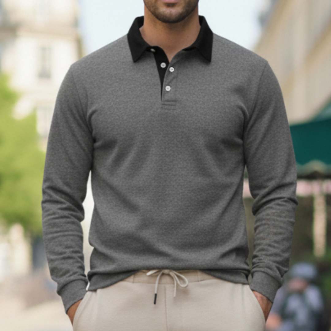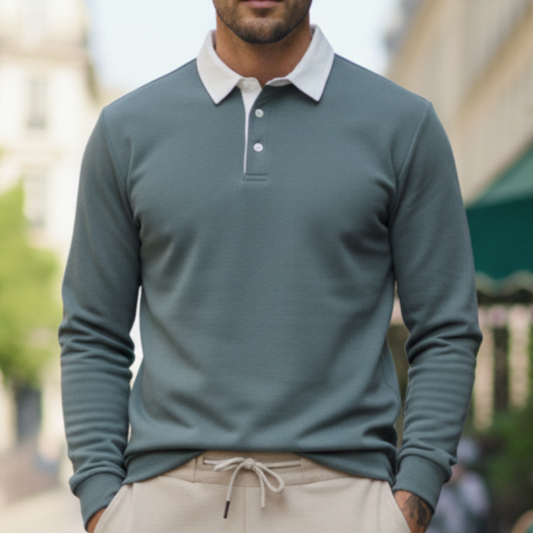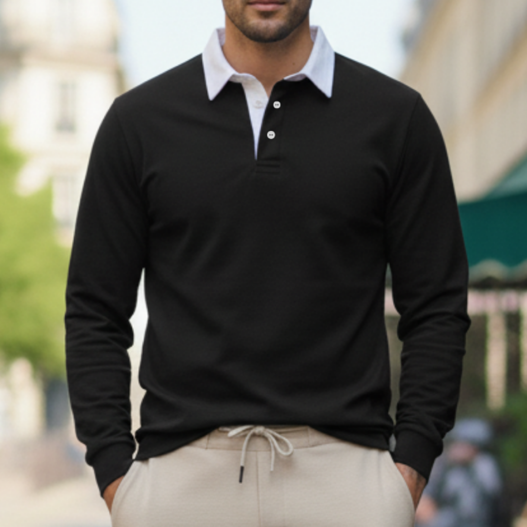 Deze heren polo trui met lange mouwen en contrasterende kraag is een stijlvolle keuze voor een verzorgde smart casual look en perfect voor dagelijks gebruik én nette momenten. De polokraag met knoopsluiting geeft een klassieke uitstraling, terwijl de geribde manchetten en ribboord aan de zoom zorgen voor een comfortabele pasvorm die mooi in model blijft. Toon de trui in een recht vooraanzicht op model met de bovenste knoop open, zodat de kraagdetails, knopen en het silhouet direct zichtbaar zijn. Een veelzijdige herentrui die moeiteloos combineert met chino’s of een nette broek voor werk, diner en weekend.
