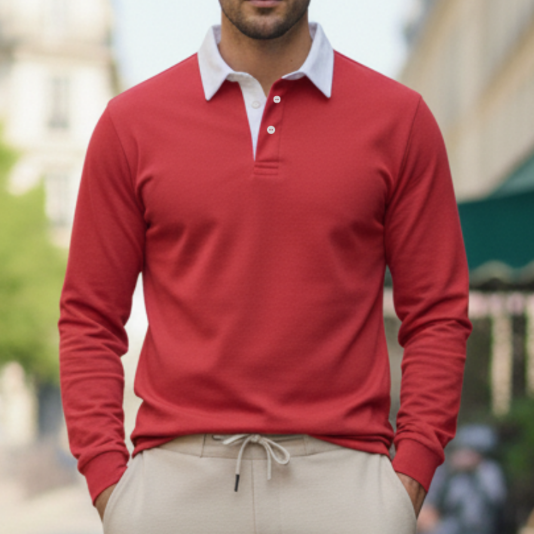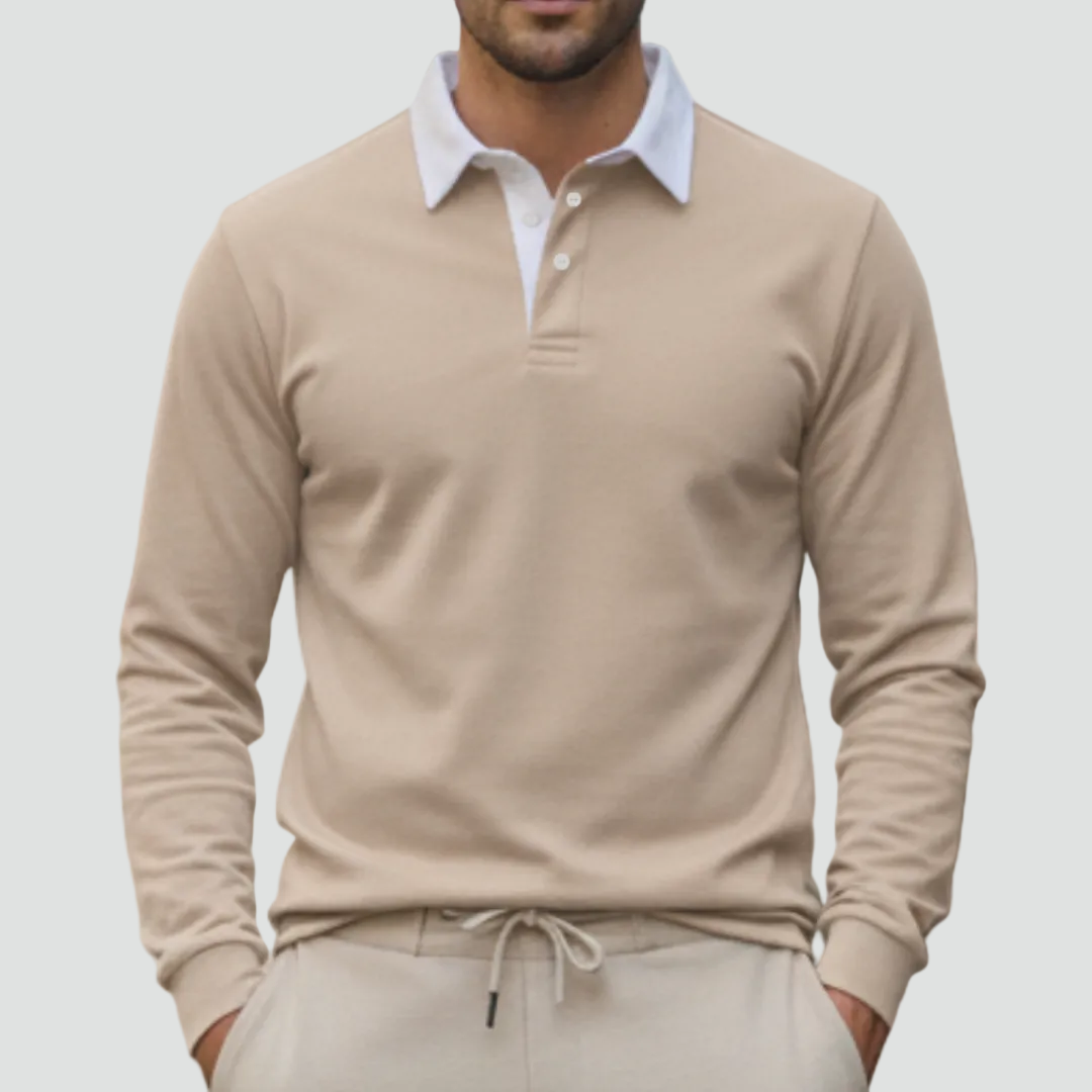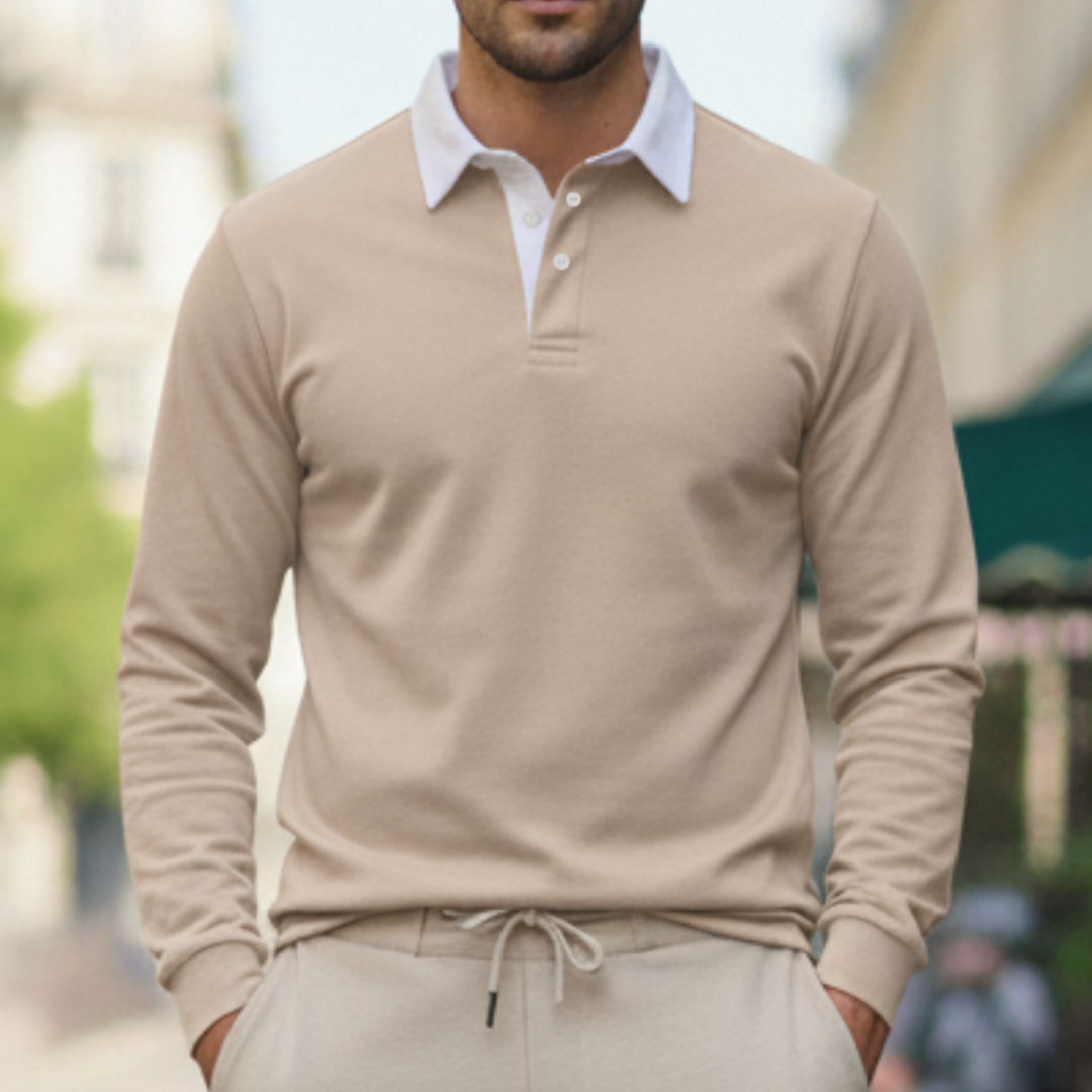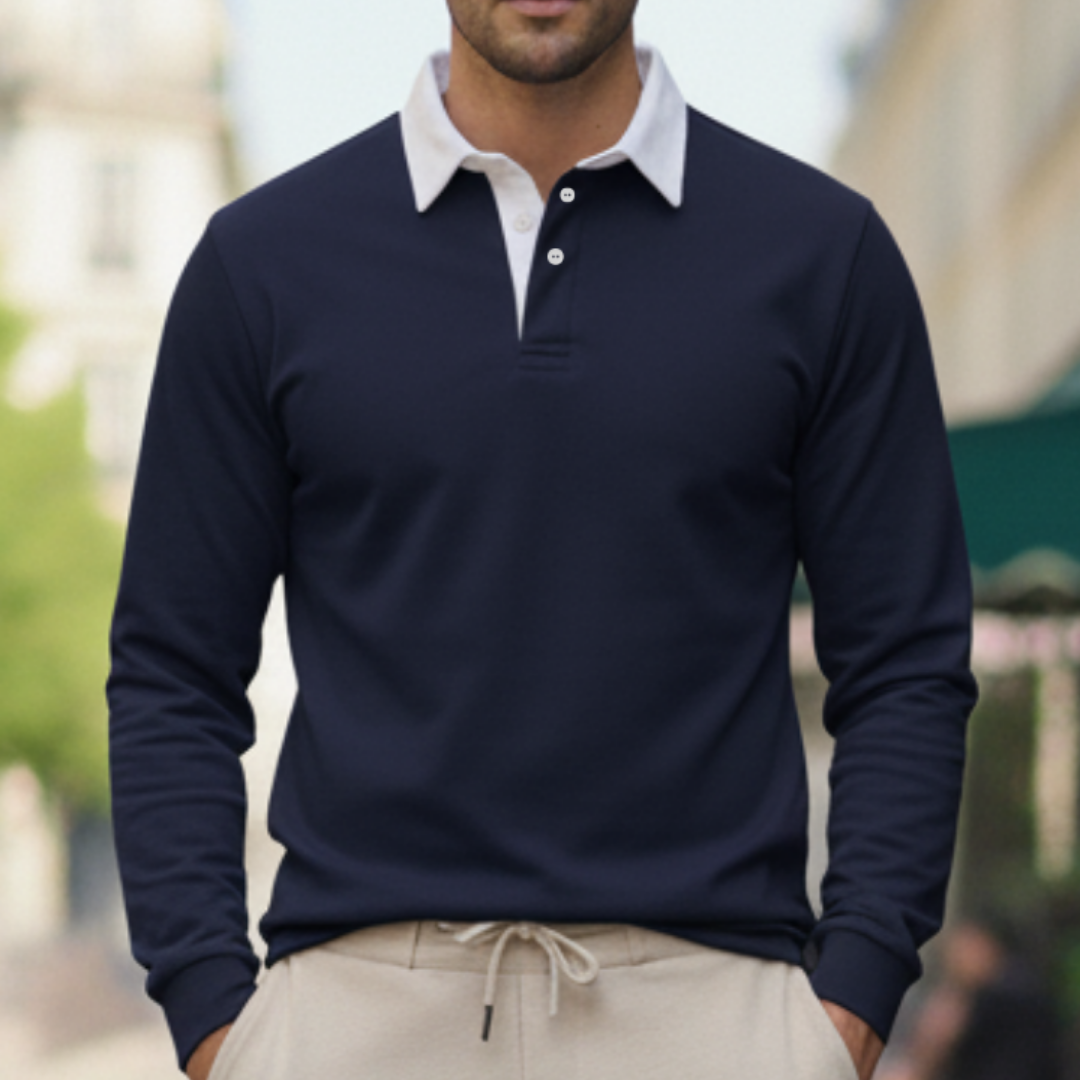 Deze heren polo trui met lange mouwen en contrasterende kraag is een stijlvolle keuze voor een verzorgde smart casual look en perfect voor dagelijks gebruik én nette momenten. De polokraag met knoopsluiting geeft een klassieke uitstraling, terwijl de geribde manchetten en ribboord aan de zoom zorgen voor een comfortabele pasvorm die mooi in model blijft. Toon de trui in een recht vooraanzicht op model met de bovenste knoop open, zodat de kraagdetails, knopen en het silhouet direct zichtbaar zijn. Een veelzijdige herentrui die moeiteloos combineert met chino’s of een nette broek voor werk, diner en weekend.