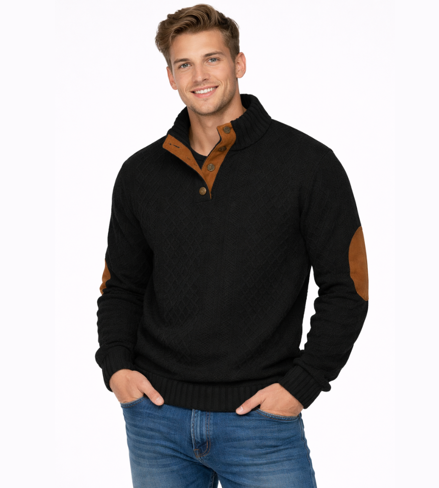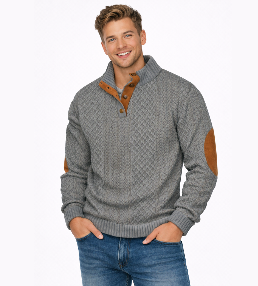 Deze heren trui met luxe kabelpatroon en stijlvolle elleboogstukken combineert een klassieke uitstraling met moderne verfijning. Het rijke patroon geeft de trui een tijdloze, elegante look, terwijl de elleboogstukken zorgen voor een subtiel, karaktervol accent. De hoge kraag met knoopsluiting maakt het geheel compleet en biedt extra comfort tijdens koelere dagen. Een veelzijdig kledingstuk dat perfect past bij zowel casual als nette outfits.