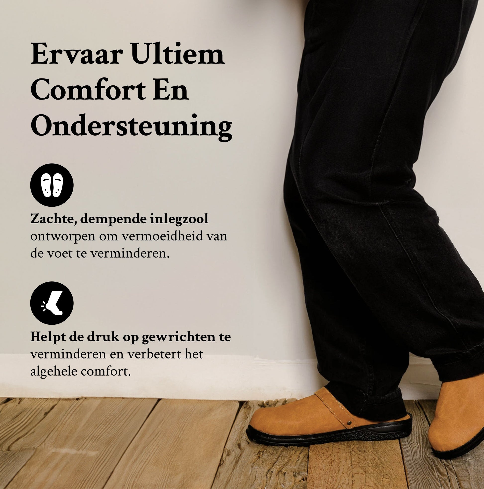Zoek je orthopedische pantoffels heren die stevig zitten en direct verlichting en comfort geven? Deze instapper met verstelbare hielband, steunend voetbed en stabiele antislip zool laat je de hele dag zeker en ontspannen lopen, van thuiskantoor tot snelle boodschap.