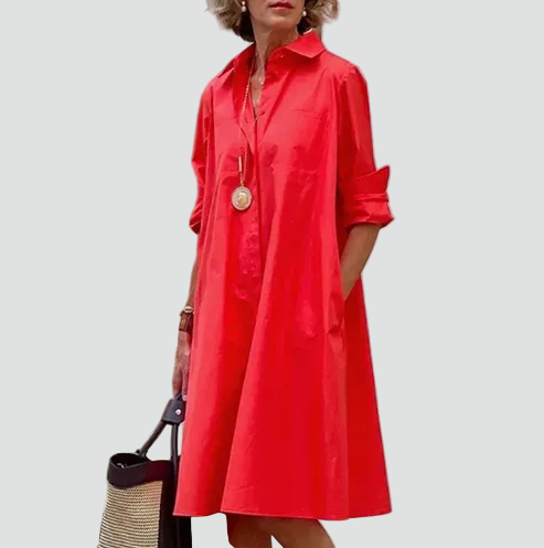 Deze stijlvolle midi jurk voor vrouwen combineert een tijdloos overhemdsilhouet met een vrouwelijke en comfortabele uitstraling. Het losvallende ontwerp zorgt voor een elegant draaggevoel en biedt volop bewegingsvrijheid gedurende de dag. De overhemdkraag geeft de jurk een nette, verzorgde look die moeiteloos past bij verschillende gelegenheden. Dankzij de praktische zakken is de jurk niet alleen stijlvol, maar ook functioneel in dagelijks gebruik. De midi lengte zorgt voor een flatterend silhouet en maakt dit item geschikt voor zowel casual als meer geklede momenten. Een veelzijdige jurk die eenvoudig te stylen is met verschillende accessoires en schoenen.